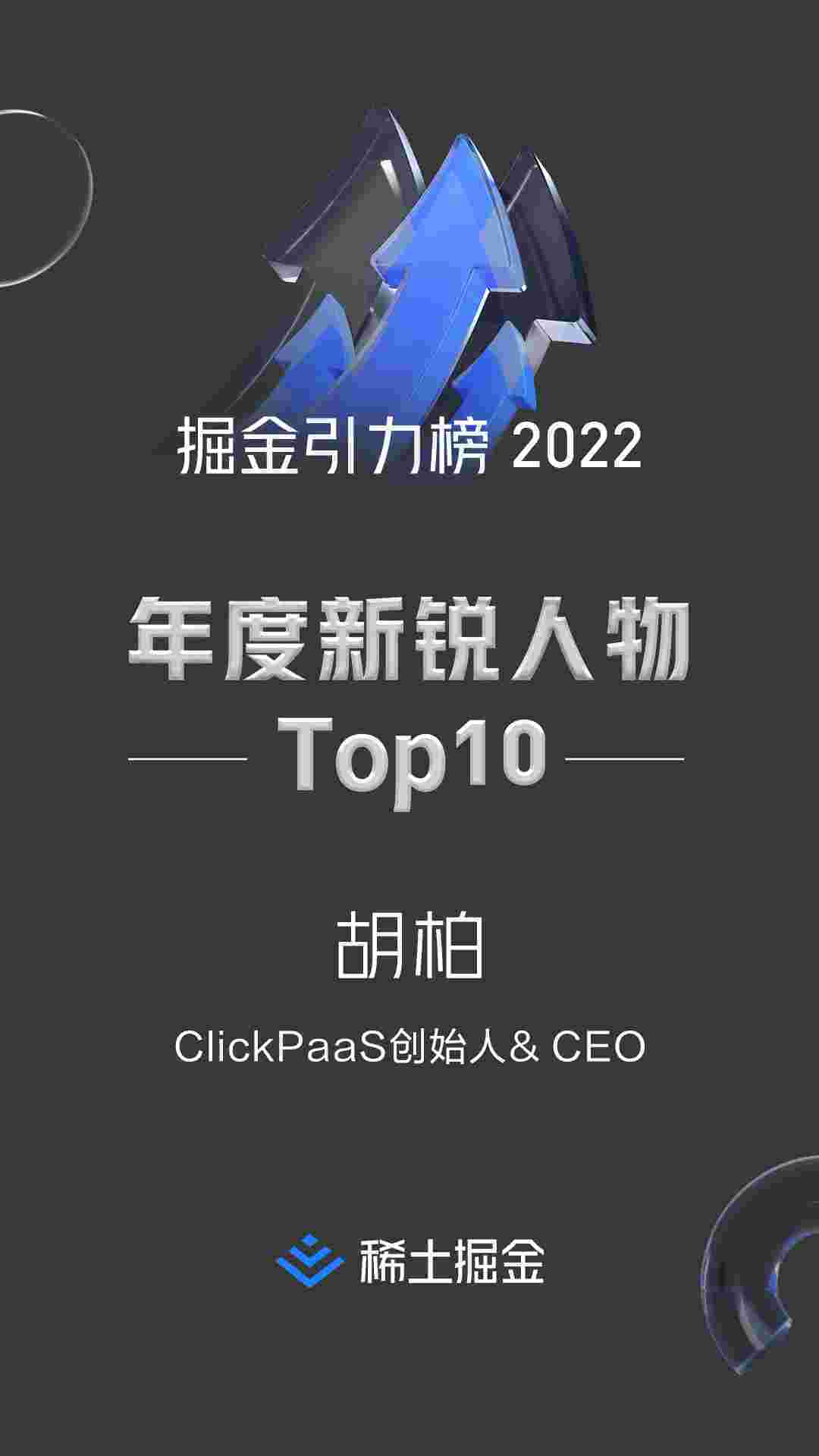 2022年1月6日,,,稀土掘金社区第一届「掘金未来大会」成功举办,,,,会上发布了“2022 稀土掘金引力榜 年度新锐人物”榜单,,,,上海爱湃斯科技有限公司(简称华为钱包)创始人及CEO胡柏实力入选年度新锐人物TOP 10。。。